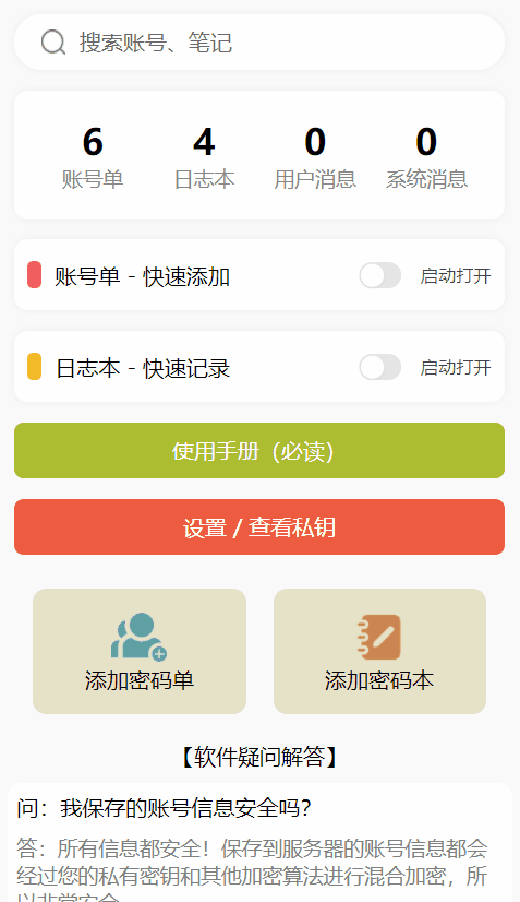 使用本软件前必须设置私钥,私钥是数据加密的根本,私钥用于加密您的数据(账号单和日志本)